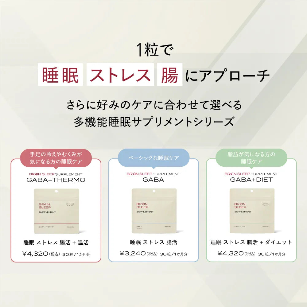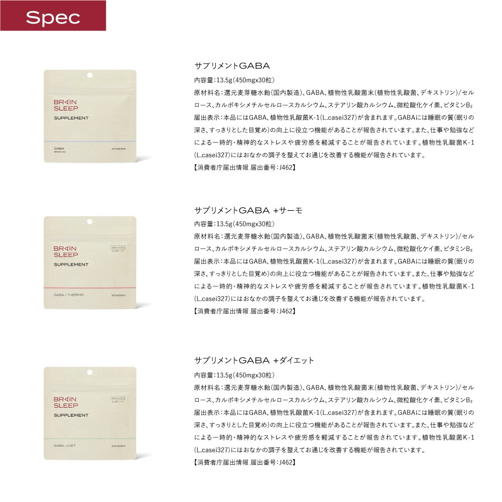 睡眠の質、深い眠りとすっきりとした目覚めの向上、仕事や勉強などによる一時的かつ精神的なストレスや疲労感の軽減に役立つ機能をもつ機能性関与成分GABAを100㎎配合しています。