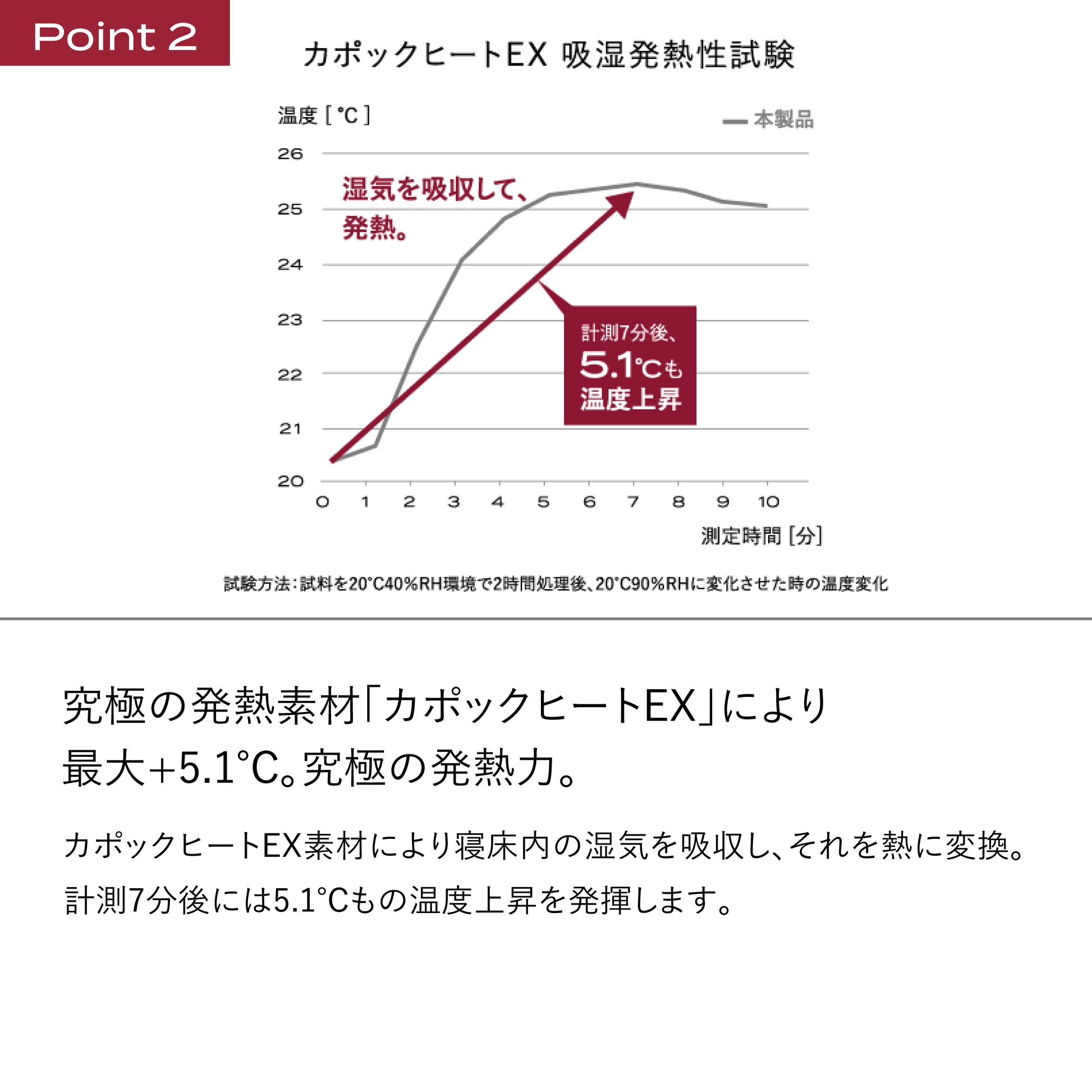 カポックヒートEX素材により寝床内の湿気を吸収し、それを熱に変換。 計測7分後には5.1℃もの温度上昇を発揮します。