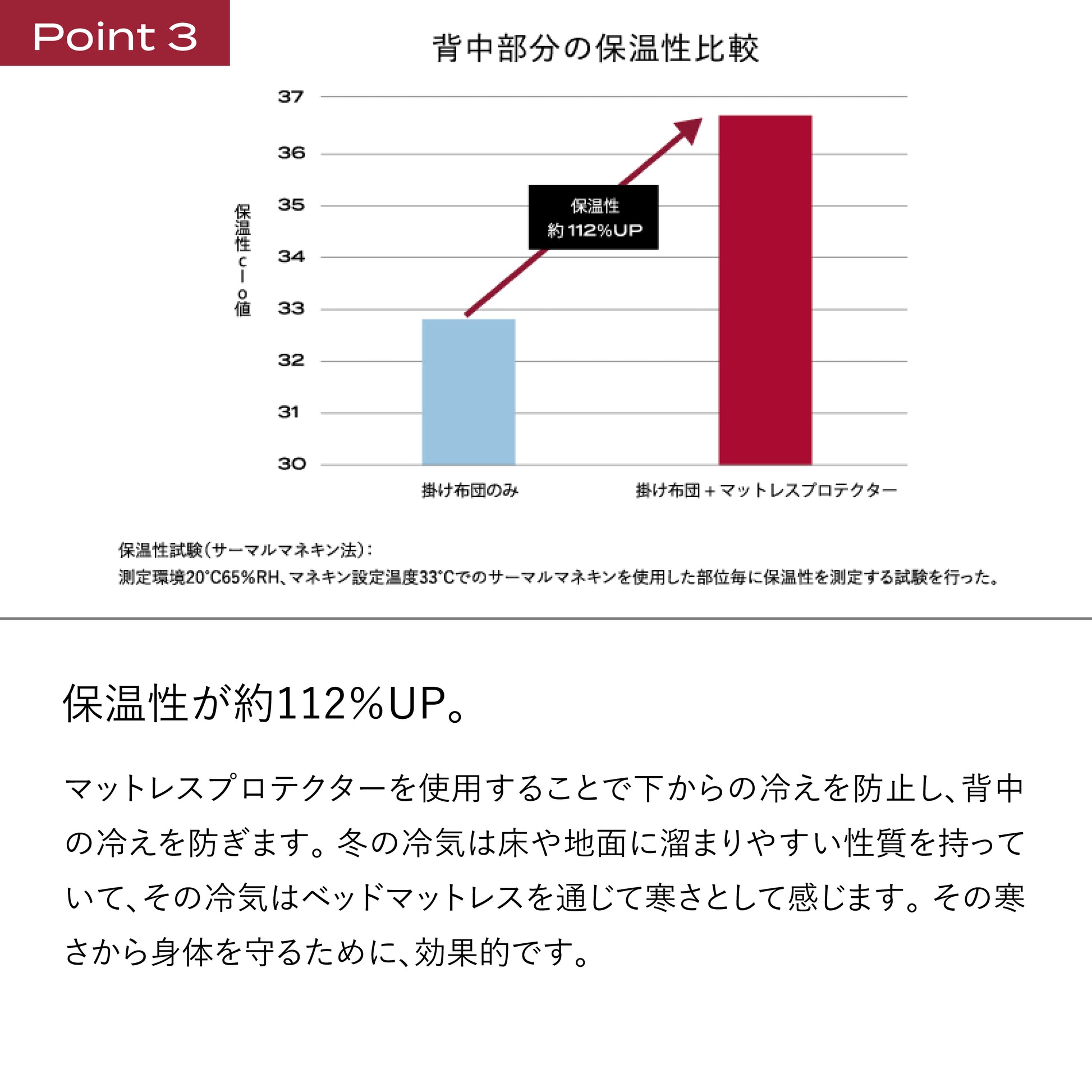 マットレスプロテクターを使用することで下からの冷えを防止し、背中の冷えを防ぎます。 冬の冷気は床や地面に溜まりやすい性質を持っていて、その冷気はベッドマットレスを通じて寒さとして感じます。 その寒さから身体を守るために、効果的です。